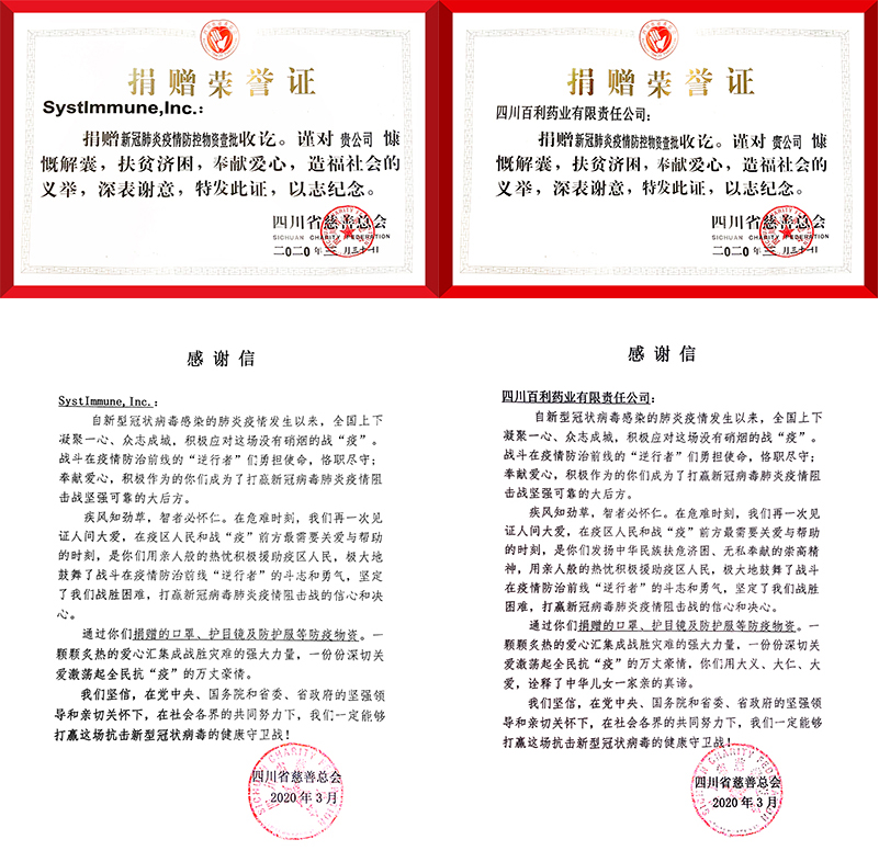 東升國際藥業攜手美國西雅圖免疫,中美企業共同通過四川慈善總會,向四川和湖北等一線醫院分批次捐贈醫用外科口罩和N95口罩、護目鏡、防護服等防護用品。向全國幾十家醫院捐贈抗病毒藥物新博林(利巴韋林顆粒)和提高免疫的好好黃芪顆粒等,助力一線醫護抗疫